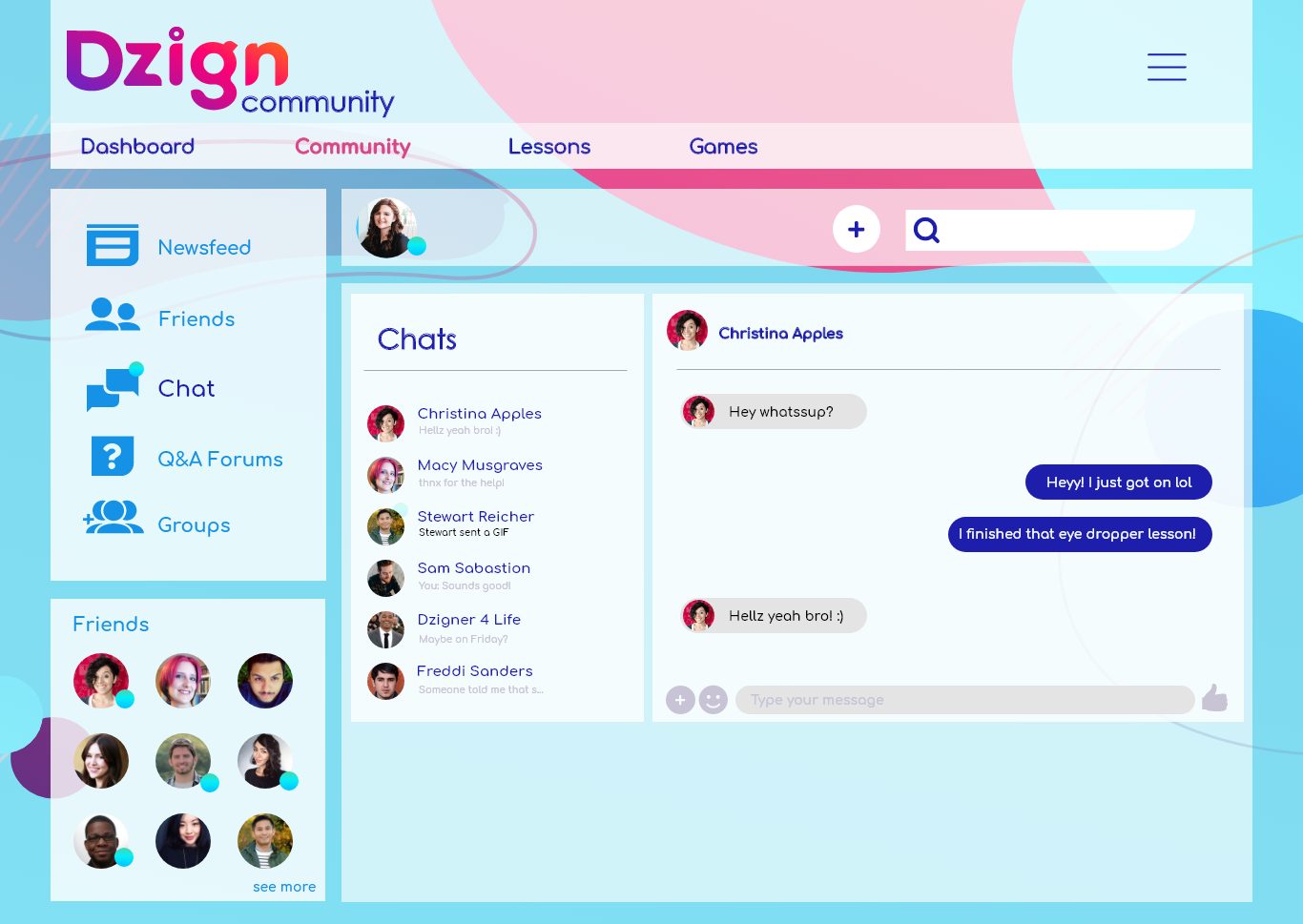 The website also features a social media style news feed, friends, Q&A forums, and groups. The idea behind this website is to teach people naturally through community, fun, and side-by-side lessons.